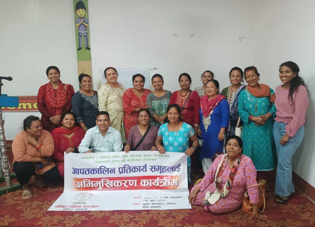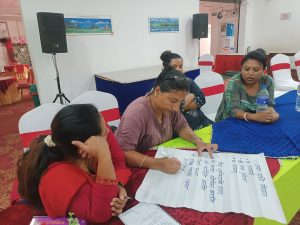 One day orientation programme for Emergency Response Team (ERT) member on 16th june 2016 on krishna caterings, kirtipur,kathmandu .There are 27 no of participants among them 24 female and 3 male. The programme is divided into five sessions.(i)Inauguration (ii)concept of DRR.CCA and vulnerable community (iii)DRR preparedness and recovery (iV)DRR plan and implementation mechanism of kirtipur municipality (v)Role and Responsibilities of ERT. Ms Man kumari BK secretory of DWN shared objectives of the program highlighting why DWN has formulated ERT and what was the vision for the intervention. Mr Ram Sundar Nepali a facilitator ,facilitated the program.Also Mr Kabir Maharjan focal person of kirtipur municipality share DRR structures ,strategies and implementation plan.